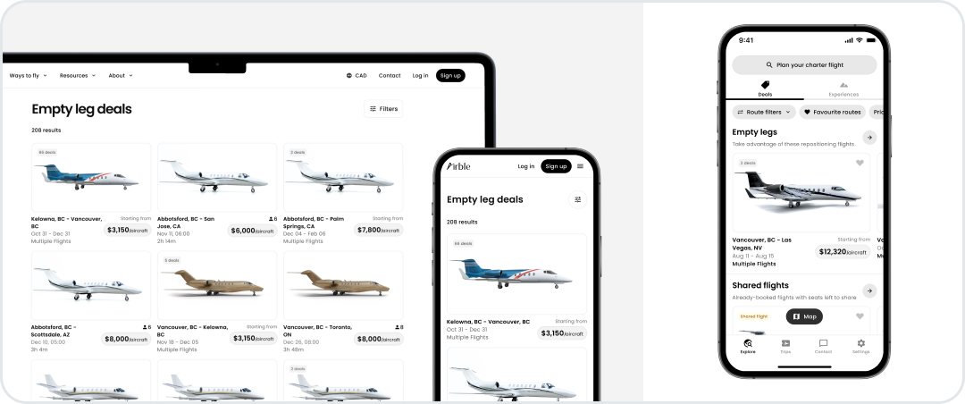 Airble offers a unique and user-friendly platform for booking empty leg flights. With our app or website, you can easily browse available flights, view prices and details, and book your flight with just a few clicks. We work directly with our partners to ensure that our prices are competitive and that you're getting the best deal possible.